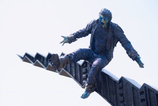 Με τον ΣΥΡΙΖΑ να κλείνει 100 ημέρες στην εξουσία, η Ελλάδα απέκτησε το πρώτο της μνημείο της κρίσης. Χέρια απλωμένα, στόμα ανοιχτό, πρόσωπο στο οποίο ζωγραφίζεται η απόγνωση. Το γλυπτό δείχνει έναν άνδρα να κρεμιέται από έναν χρηματοπιστωτικό δείκτη που βρίσκεται σε ελεύθερη πτώση.