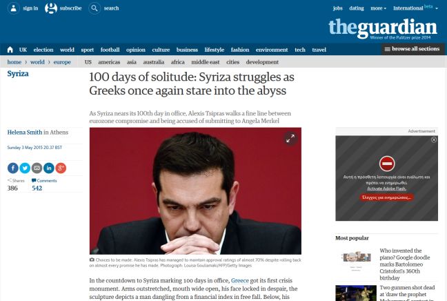Πέντε χρόνια μετά την είσοδο της χώρας στο πρόγραμμα διάσωσης, οι Έλληνες δεν ξέρουν τι να σκεφτούν, αναφέρει η αρθρογράφος της βρετανικής εφημερίδας, Ελένα Σμιθ. Αυτό που ξέρουν είναι ότι μετά από πέντε χρόνια λιτότητας και θυσιών, είναι σαν τον άνδρα που απεικονίζει το γλυπτό του Νυφαδόπουλου… για άλλη μια φορά κοιτάζουν την άβυσσο.