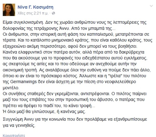 Με ανάρτησή της στο λογαριασμό που διατηρεί στο Facebook, η βουλευτής του ΣΥΡΙΖΑ επιχειρεί να συνδέσει το πρωτοφανές έγκλημα με την οικονομική κρίση, τον πιλότο της Germanwings που έριξε το αεροπλάνο και το νεοφιλελεύθερο μοντέλο.
