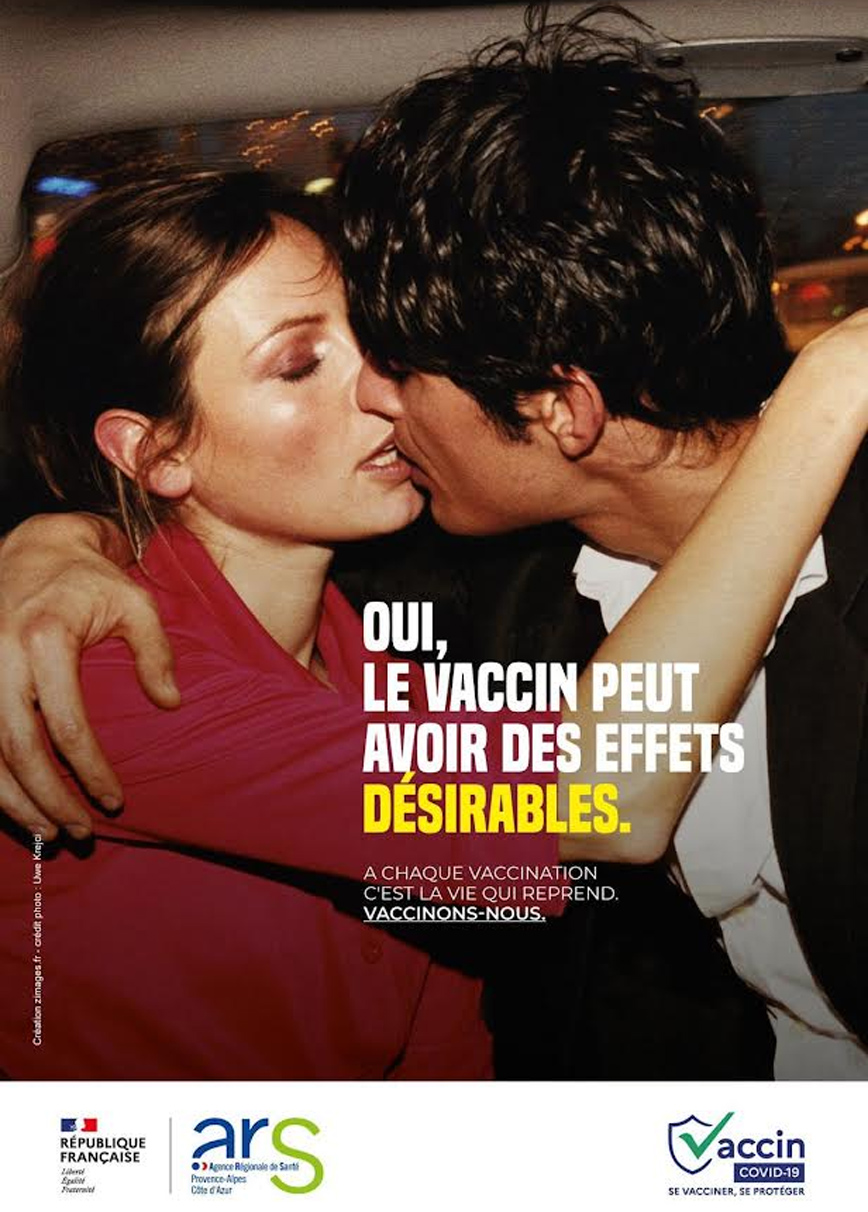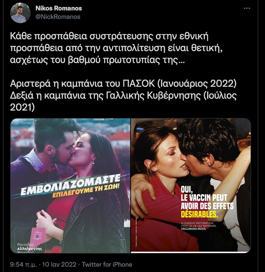 Ειδικότερα, παραθέτοντας την ελληνική και τη γαλλική αφίσα που δείχνουν ένα ζευγάρι νέων να φιλιέται στο στόμα επισημαίνει πως η πρώτη είναι μεν τωρινή (υπό τον τίτλο «Εμβολιαζόμαστε, επιλέγουμε τη ζωή»), αλλά η δεύτερη έχει προηγηθεί στο εξωτερικό από τον Ιούλιο του 2021.