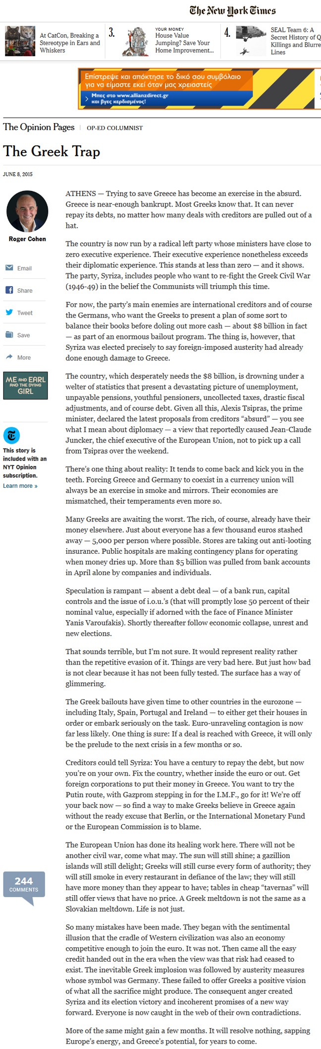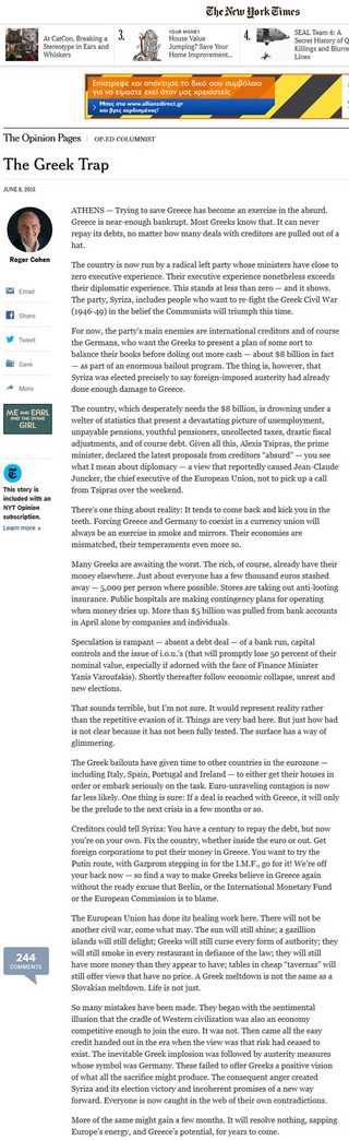 «Η χώρα διοικείται από ένα ριζοσπαστικό αριστερό κόμμα του οποίου οι υπουργοί έχουν σχεδόν μηδενική εκτελεστική εμπειρία. Ακόμα κι έτσι όμως, η εκτελεστική τους εμπειρία είναι μεγαλύτερη από τη διπλωματική τους- αυτή βρίσκεται υπό το μηδέν και φαίνεται. Ο ΣΥΡΙΖΑ περιλαμβάνει ανθρώπους που θέλουν να ξαναπολεμήσουν στον ελληνικό εμφύλιο με την πεποίθηση πως αυτή τη φορά οι Κομμουνιστές θα θριαμβεύσουν», γράφει ο Roger Cohen.