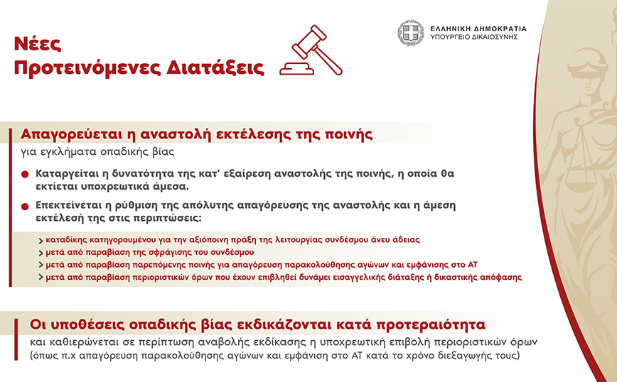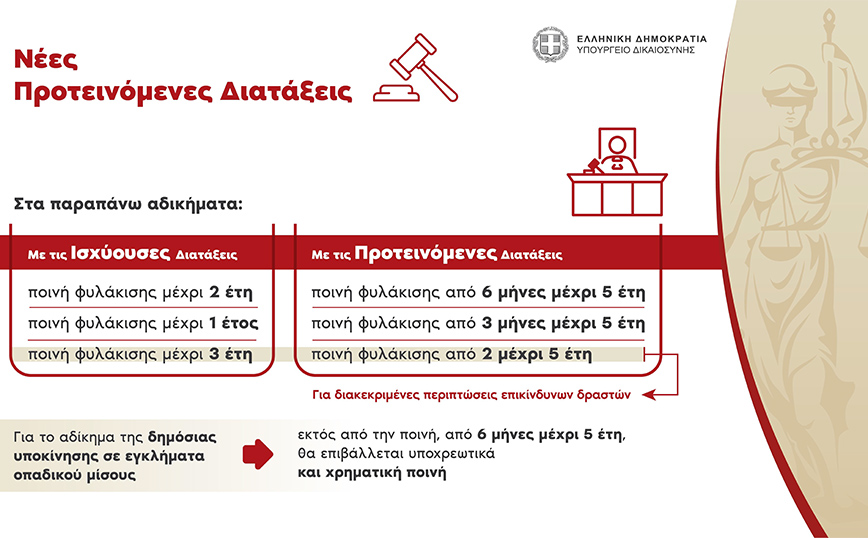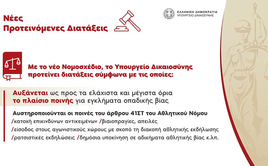 Συγκεκριμένα ο υπουργός ανέφερε ότι αυξάνεται το πλαίσιο ποινής για εγκλήματα οπαδικής βίας, από έξι μήνες έως 5 έτη. Σε διακεκριμένες περιπτώσεις επικίνδυνων δραστών θα προβλέπεται ποινή από 2 έως 5 έτη.