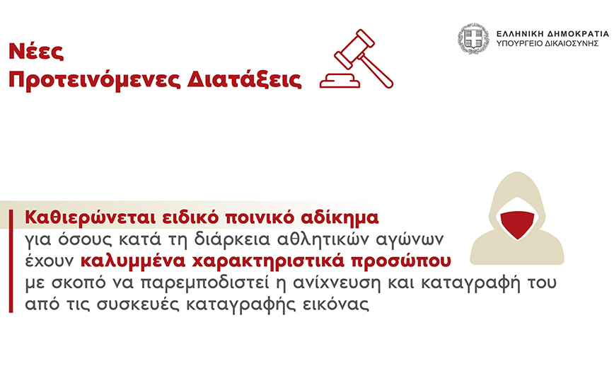Προτείνεται ακόμα ειδικό ποινικό αδίκημα για όσους έχουν καλυμμένα χαρακτηριστικά προσώπου σε αγώνες, με σκοπό να παρεμποδιστεί η ανίχνευσή τους.