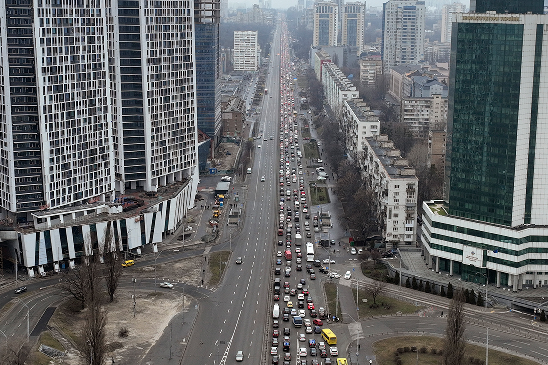 Οι εικόνες επίσης από τους δρόμους του Κιέβου με χιλιάδες αυτοκίνητα να είναι μποτιλιαρισμένα ενώ οι πολίτες προσπαθούν να ξεφύγουν από τη φρίκη του πολέμου είναι χαρακτηριστικές.