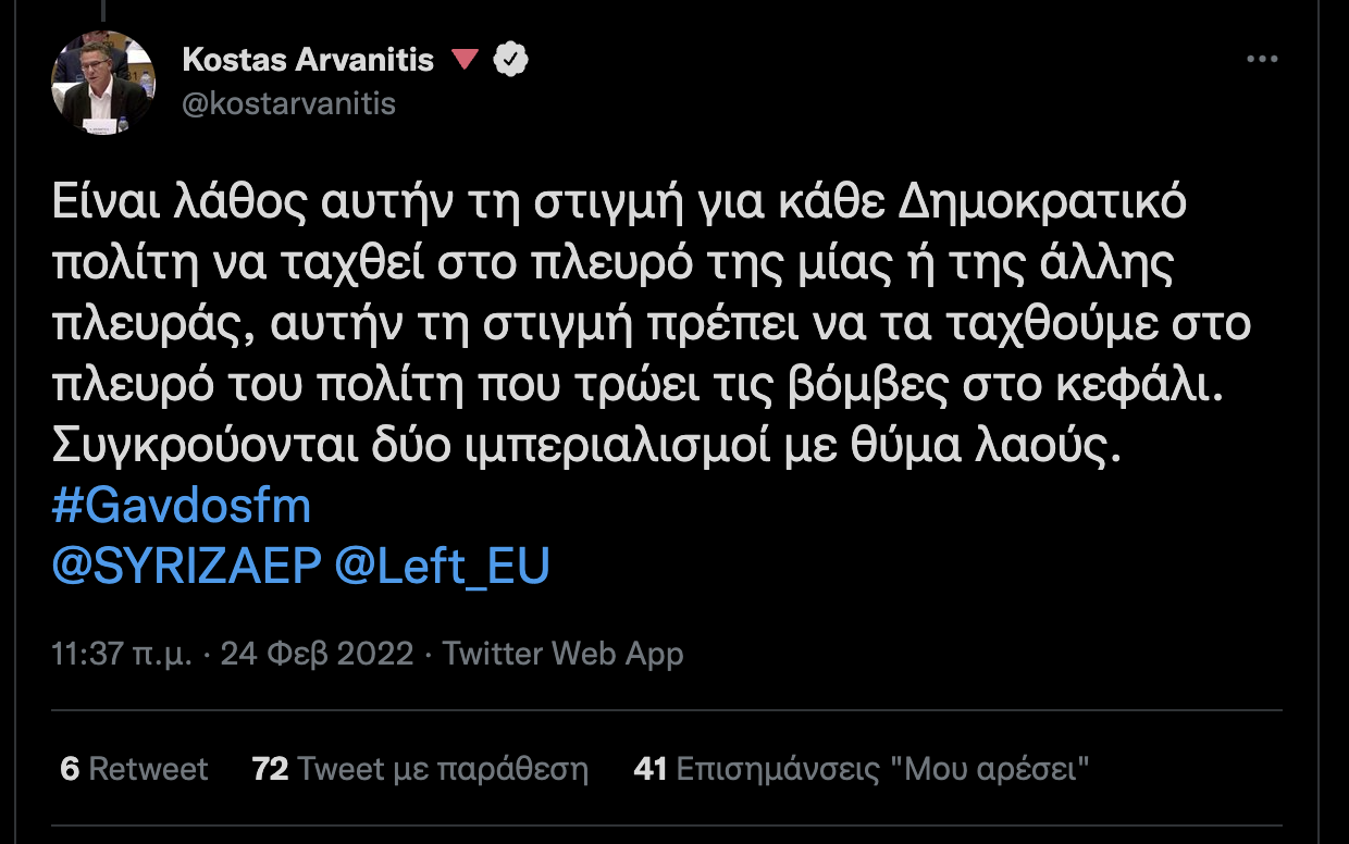 Ποικίλα σχόλια έχει προκαλέσει η ανάρτηση του ευρωβουλευτή του ΣΥΡΙΖΑ – Προοδευτική Συμμαχία Κώστα Αρβανίτη στο Twitter που επί της ουσίας δεν παίρνει ανοικτά θέση κατά της ρωσικής εισβολής στο έδαφος της Ουκρανίας, παρά την ξεκάθαρη άποψη τόσο του κόμματος της αξιωματικής αντιπολίτευσης όσο και του συνόλου των υπολοίπων κομμάτων.