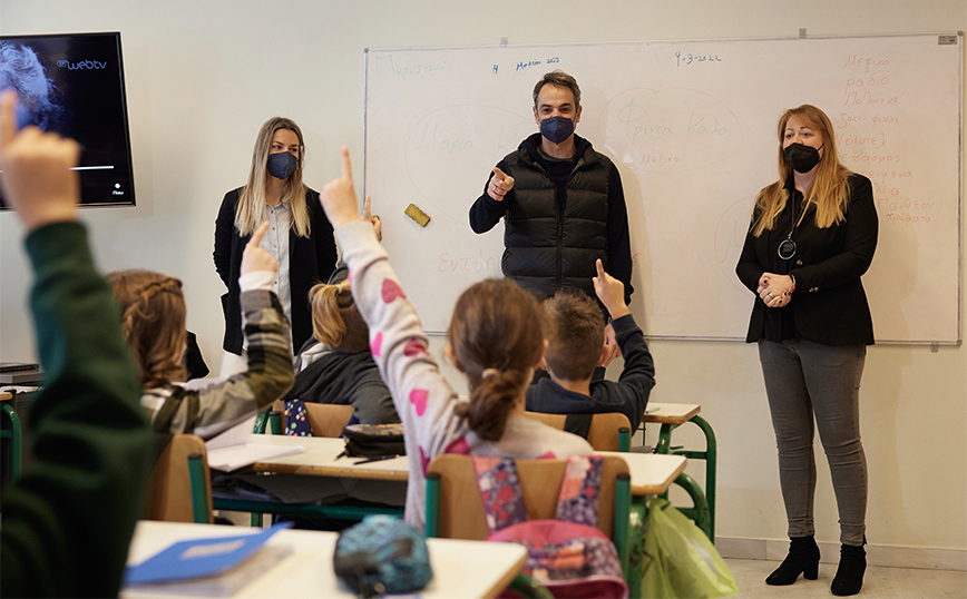Στο Δημοτικό Σχολείο Βάρης Μάννα Σύρου βρέθηκε ο πρωθυπουργός Κυριάκος Μητσοτάκης στο πλαίσιο της επίσκεψής του στο νησί. Ο πρωθυπουργός μιλώντας στους μαθητές είπε ότι σύντομα δεν θα φορούν μάσκα μέσα στην τάξη.