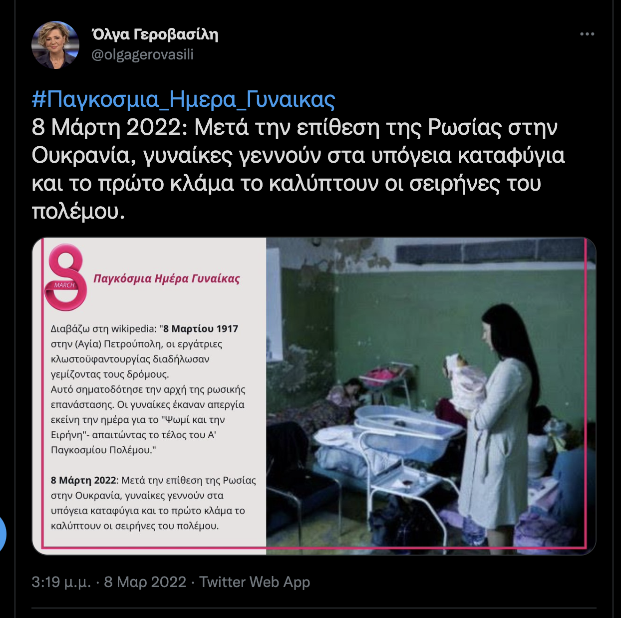 Όπως γράφει χαρακτηριστικά στον προσωπικό της λογαριασμό στο Twitter, «διαβάζω στη wikipedia: “8 Μαρτίου 1917 στην (Αγία) Πετρούπολη, οι εργάτριες κλωστοϋφαντουργίας διαδήλωσαν γεμίζοντας τους δρόμους. Αυτό σηματοδότησε την αρχή της ρωσικής επανάστασης. Οι γυναίκες έκαναν απεργία εκείνη την ημέρα για το “Ψωμί και την Ειρήνη” – απαιτώντας το τέλος του Α’ Παγκοσμίου Πολέμου.