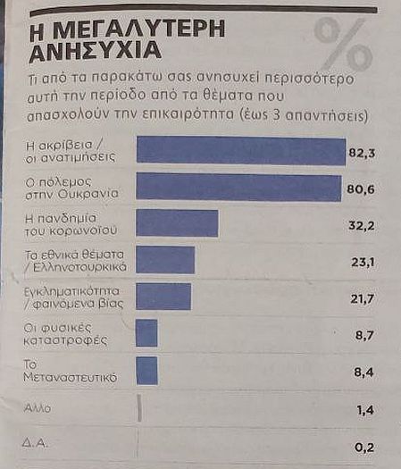 Σύμφωνα με τις απαντήσεις των πολιτών, περισσότεροι από οκτώ στους δέκα είναι ανήσυχοι για την ακρίβεια και τις ανατιμήσεις στην αγορά (82,3%), ενώ σε αντίστοιχα επίπεδα κυμαίνεται η ανησυχία για τον πόλεμο στην Ουκρανία (80,6%).