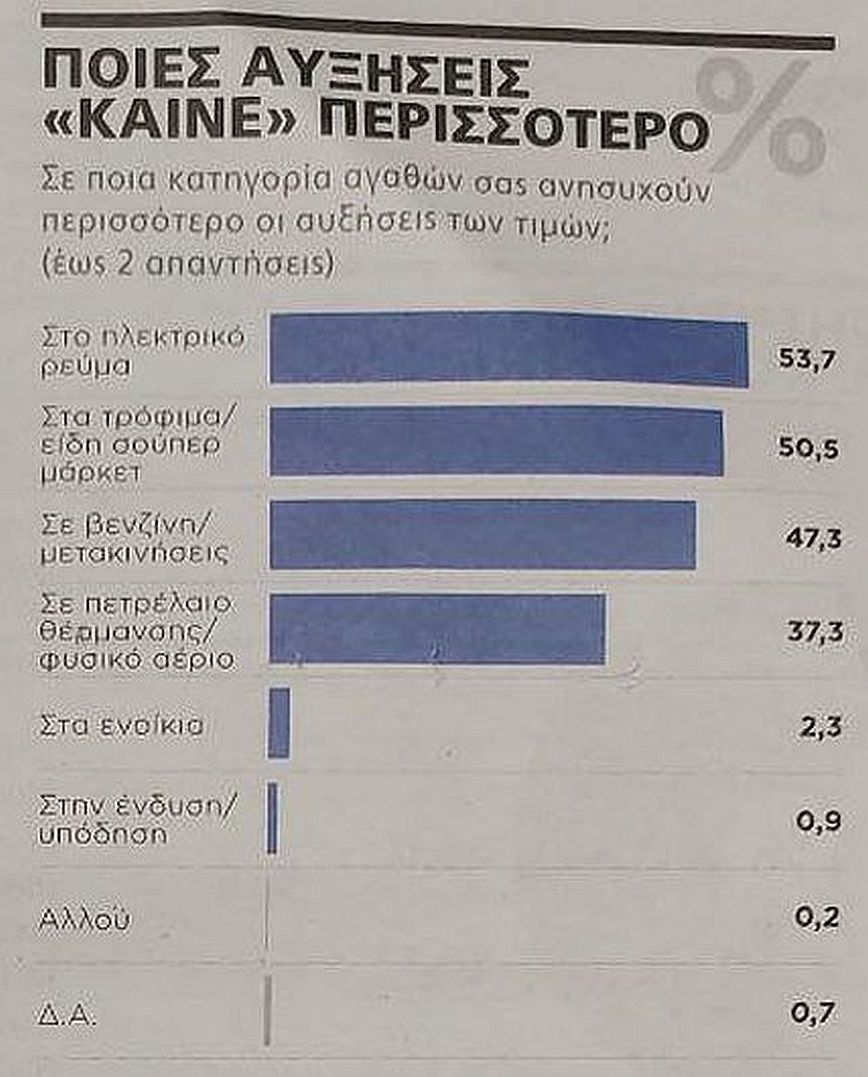 Οι φουσκωμένοι λογαριασμοί ηλεκτρικού ρεύματος (σε ποσοστό 53,7%), οι αυξημένες δαπάνες για την προμήθεια των τροφίμων (με 50,5%), η ακριβότερη βενζίνη που πληρώνουμε για τις μετακινήσεις (47,3%), καθώς και οι ανατιμήσεις σε πετρέλαιο και σε φυσικό αέριο που χρησιμοποιούμε για τη θέρμανση (37,3%) είναι οι παράγοντες που ανησυχούν τους Έλληνες.