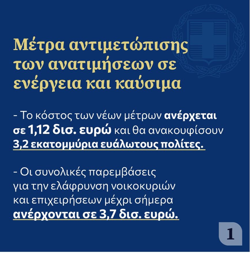 - Τα μέτρα ξεπερνούν το 1 δισ. ευρώ και απευθύνονται σε 3,2 εκατ. συμπολίτες μας. Το συνολικό ύψος των παρεμβάσεων αγγίζει τα 4 δισ. μέχρι σήμερα.