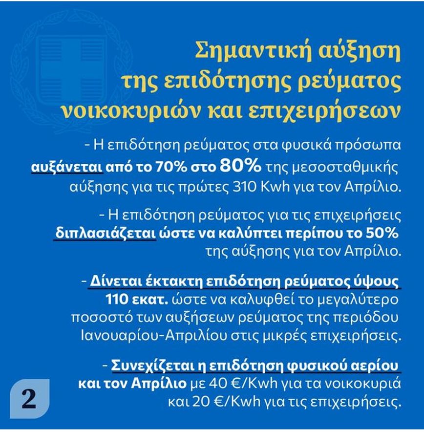 - Συνεχίζεται η επιδότηση φυσικού αερίου και τον Απρίλιο με 40 €/Kwh για τα νοικοκυριά και 20 €/Kwh για τις επιχειρήσεις, με κόστος 30 εκατ. ευρώ.
