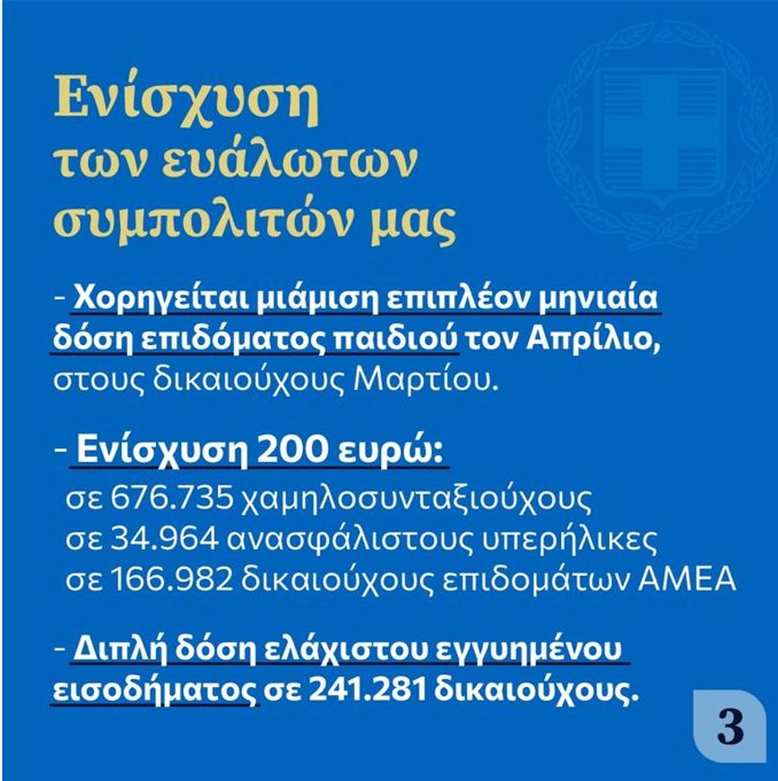 - Ενίσχυση για τους πιο αδύναμους πριν το Πάσχα: 1,5 επιπλέον μηνιαία δόση επιδόματος παιδιού. 265.000 δικαιούχοι.