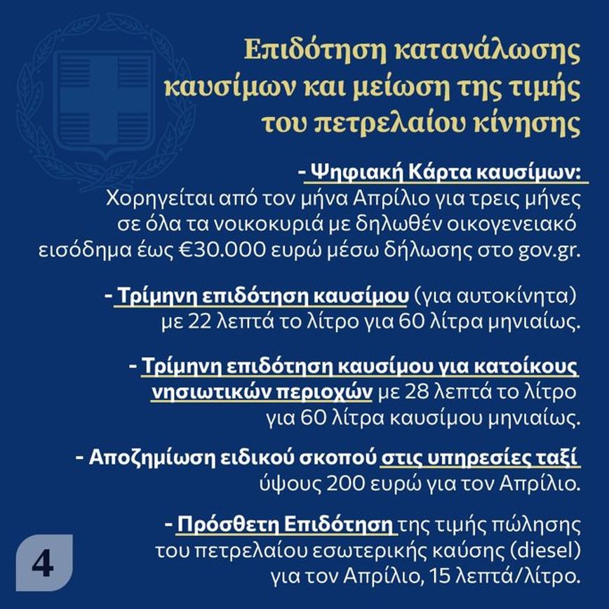 - Επιδότηση καυσίμων φυσικών προσώπων: Εκδίδεται ηλεκτρονική κάρτα καυσίμων κατά τον μήνα Απρίλιο, καλύπτει κόστος τριών μηνών (και ελεύθεροι επαγγελματίες). Φυσικά πρόσωπα με δηλωθέν οικογενειακό εισόδημα έως30.000 ευρώ. Θα δοθεί, όπως έγινε με το freedom pass, για όσους δεν έχουν θα κατατεθεί στους λογαριασμούς.