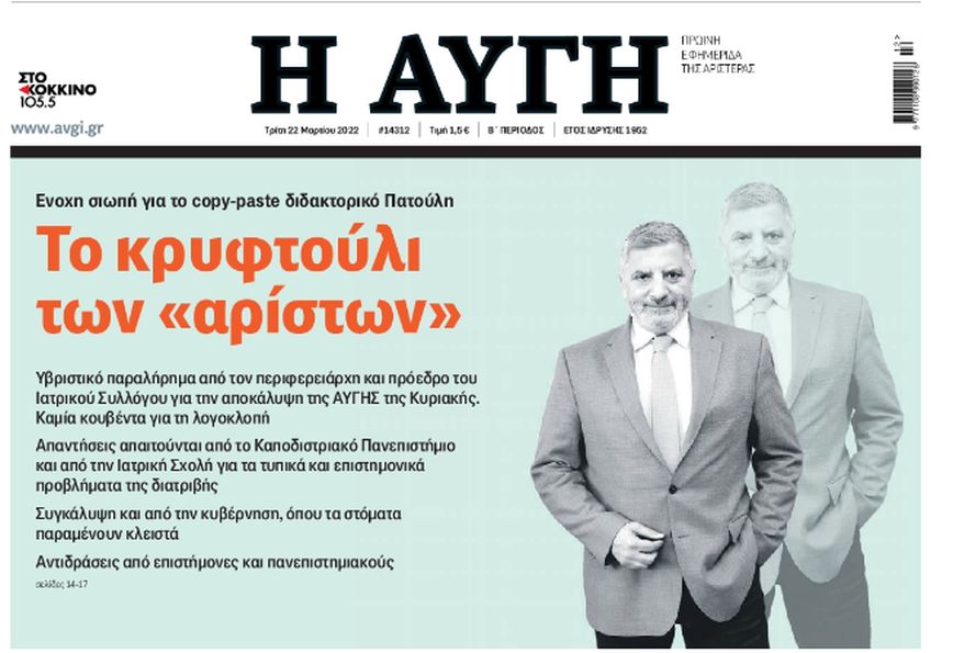 Ένα νέο δημοσίευμα της εφημερίδας Αυγή, σύμφωνα με την οποία το διδακτορικό του περιφερειάρχη Αττικής είναι προϊόν λογοκλοπής, προκάλεσε και πάλι την αντίδραση του Γιώργου Πατούλη. Η αξιολόγηση του ειδικού μέρους τής διδακτορικής διατριβής από την Ιατρική Σχολή του Πανεπιστημίου Αθηνών είναι πρωτότυπη και αυθεντική σημειώνει, παραπέμποντας σε σχετικό έγγραφο της Σχολής.