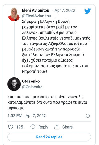 «Σήμερα η Ελληνική Βουλή μαγαρίστηκε, όταν μαζί με τον Ζελένσκι απευθύνθηκε στους Έλληνες βουλευτές νεοναζί μαχητής του τάγματος Αζόφ. Όλοι αυτοί που μεθόδευσαν αυτή την παρουσία ξευτέλισαν τον Ελληνικό λαό, που έχει χύσει ποτάμια αίματος πολεμώντας τους φασίστες παντού. Ντροπή τους!» έγραψε η πρώην βουλευτής στο Twitter, αναφερόμενη στον μαχητή του τάγματος που μίλησε στο πλαίσιο της εμφάνισης του προέδρου Ζελένσκι.