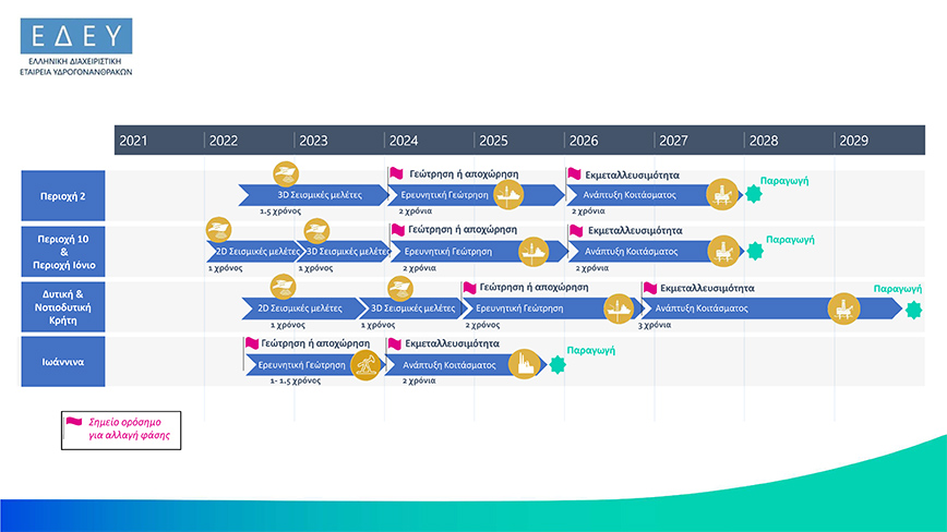 Όπως ανέφερε, το πρόγραμμα ερευνών θα ολοκληρωθεί έως το τέλος του 2023 και μπορεί οι πρώτες διερευνητικές γεωτρήσεις να γίνουν πριν το τέλος του επόμενου χρόνου.