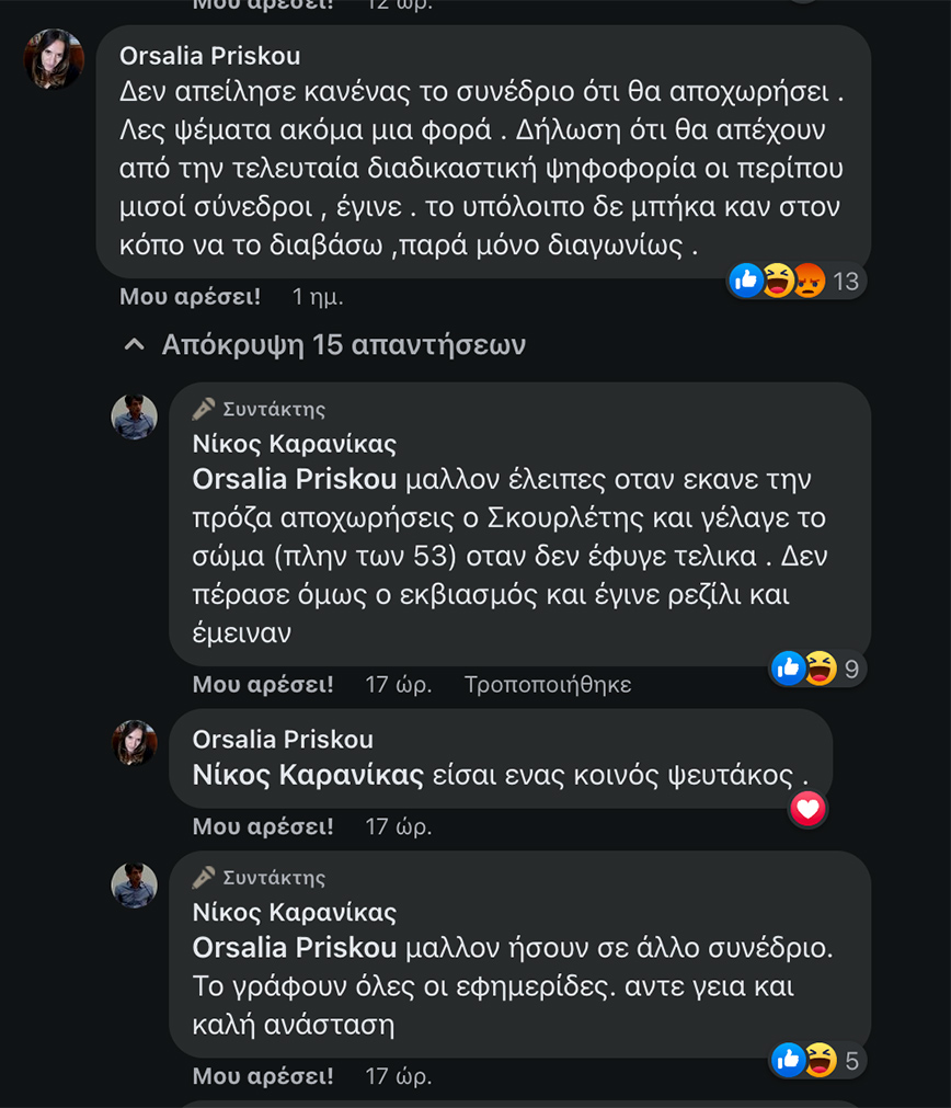 Ο κ. Καρανίκας της απάντησε: «Μάλλον έλειπες όταν έκανε την πρόζα αποχώρησης ο Σκουρλέτης και γέλαγε το σώμα (πλην των 53) όταν δεν έφυγε τελικά . Δεν πέρασε όμως ο εκβιασμός και έγινε ρεζίλι και έμειναν».