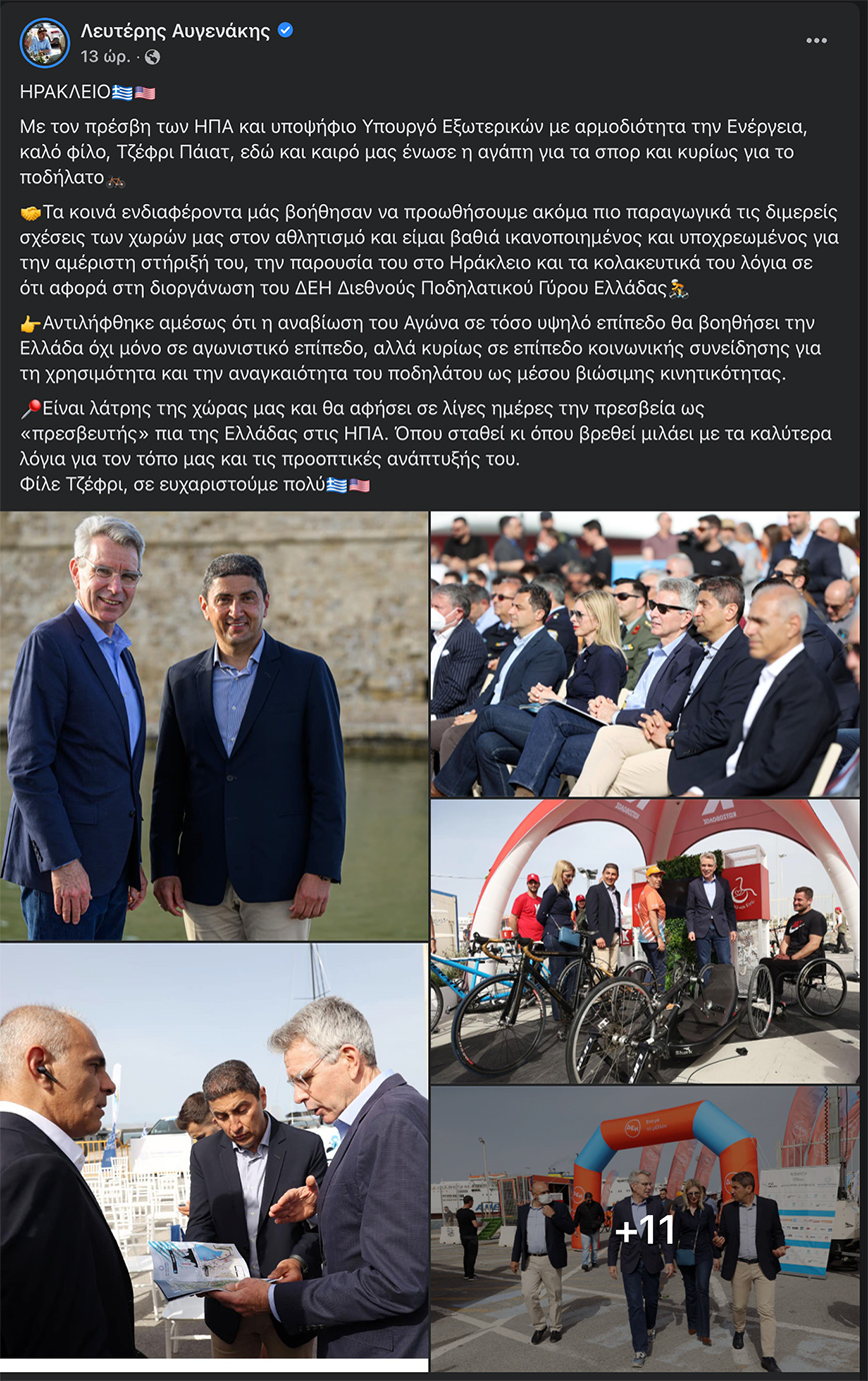 Όπως αναφέρει χαρακτηριστικά το μέλος της κυβέρνησης: «Με τον πρέσβη των ΗΠΑ και υποψήφιο Υπουργού Εξωτερικών με αρμοδιότητα την Ενέργεια, καλό φίλο, Τζέφρι Πάιατ, εδώ και καιρό μας ένωσε η αγάπη για τα σπορ και κυρίως για το ποδήλατο.