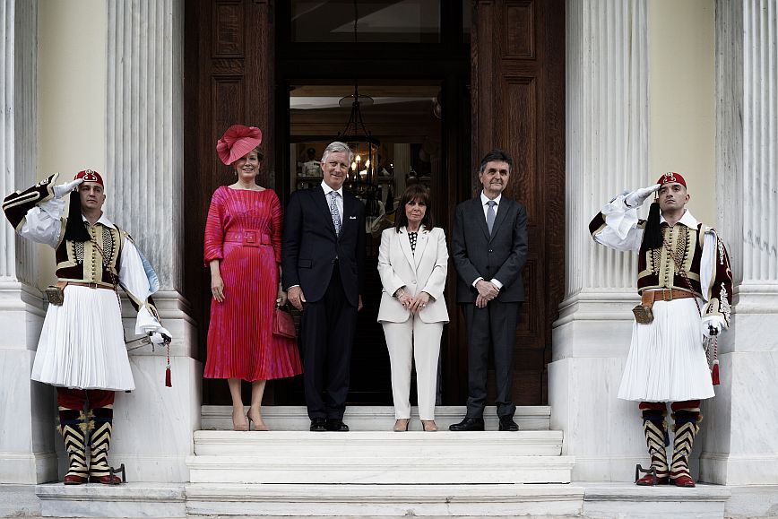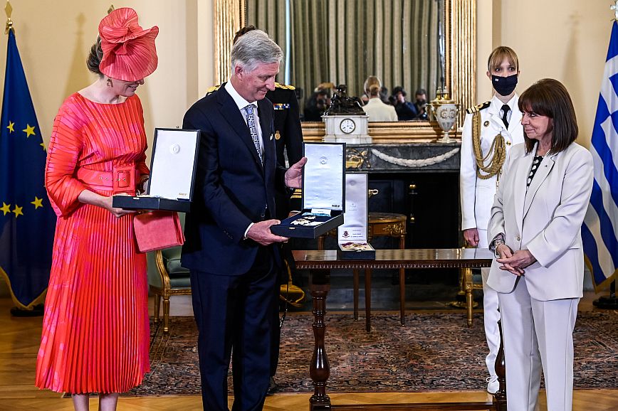 Νωρίτερα, η Πρόεδρος της Δημοκρατίας, σε ειδική τελετή στο Προεδρικό Μέγαρο, απένειμε στον Βασιλιά και στη Βασίλισσα των Βέλγων το Παράσημο του Μεγαλόσταυρου του Τάγματος του Σωτήρος.