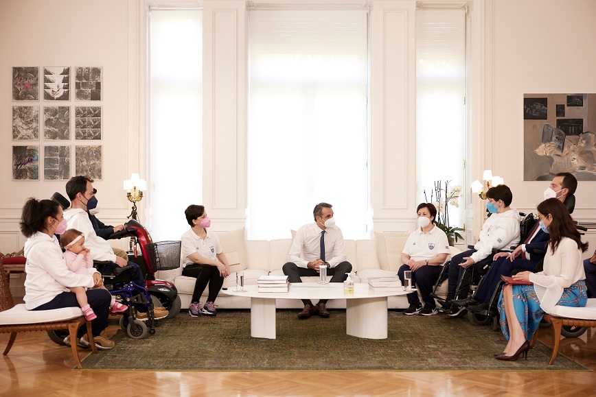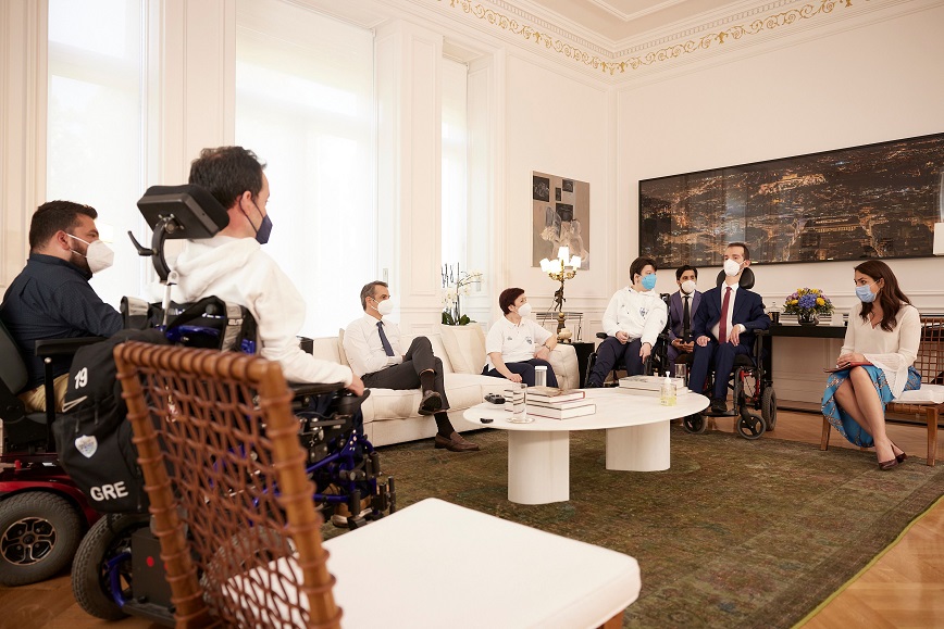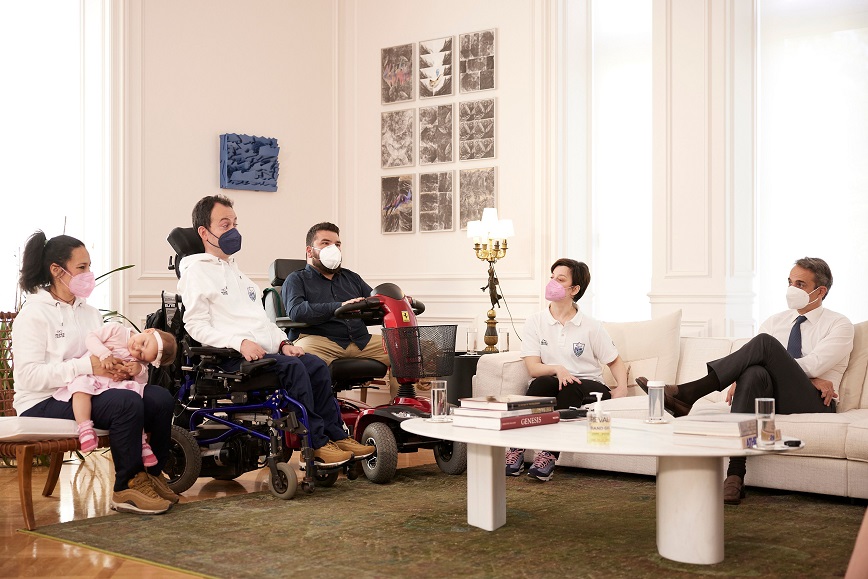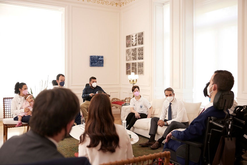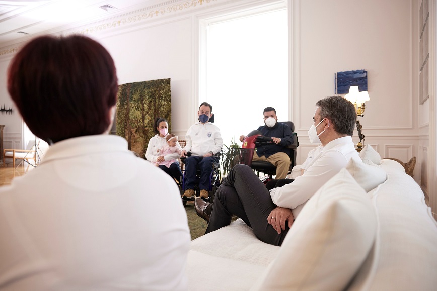 Ο Κυριάκος Μητσοτάκης συζήτησε για το πιλοτικό πρόγραμμα «Προσωπικός Βοηθός για Άτομα με Αναπηρία», στη συνάντηση που είχε το μεσημέρι στο Μέγαρο Μαξίμου με τον ευρωβουλευτή Στέλιο Κυμπουρόπουλο, τους χρυσούς παραολυμπιονίκες στο μπότσια, Γρηγόρη Πολυχρονίδη και Άννα Ντέντα και τον υπεύθυνο του Πολιτιστικού Κέντρου του δήμου Περιστερίου και δημοτικό σύμβουλο, Μπάμπη Δούναβη.