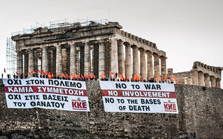 Περισσότερα από 100 άτομα με σημαίες και διπλωμένα πανό παραβίασαν με τη χρήση λοστών, τόσο την κεντρική πύλη εισόδου όσο και την εσωτερική πύλη ασφαλείας. Στη συνέχεια, αγνοώντας τις υποδείξεις του φυλακτικού προσωπικού, ανάρτησαν στο νότιο τείχος της Ακρόπολης δύο πανό με συνθήματα “όχι στον πόλεμο, καμιά συμμετοχή, όχι στις βάσεις του θανάτου” στην ελληνική και στην αγγλική γλώσσα.