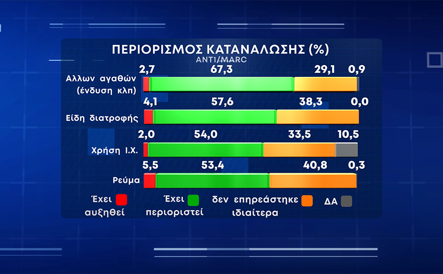 Όσο για τον περιορισμό στην κατανάλωση το 67,3% έχει περιορίσει αγαθά όπως η ένδυση, το 57,6% τα είδη διατροφής, το 54% τη χρήση αυτοκινήτου και το 53% έχει μειώσει τη χρήση του ρεύματος.