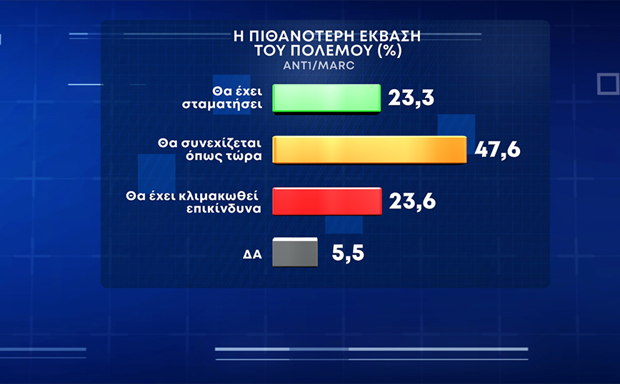 Για την έκβαση του πολέμου στην Ουκρανία το 47,6% θεωρεί πως θα συνεχιστεί όπως τώρα, το 23,6% ότι θα κλιμακωθεί, το 23,3% πως θα σταματήσει και 5,5% δεν απάντησε.