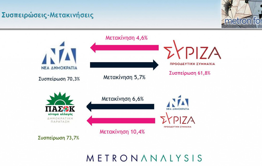 Η συσπείρωση για τη ΝΔ είναι στο 70,3% ενώ υπάρχουν μετακινήσεις προς τον ΣΥΡΙΖΑ σε ποσοστό 5,7%. Για τον ΣΥΡΙΖΑ η συσπείρωση είναι στο 61,8% (έχει δηλαδή πολλά περιθώρια ανόδου) ενώ οι μετακινήσεις προς τη ΝΔ είναι στο 4,6%.