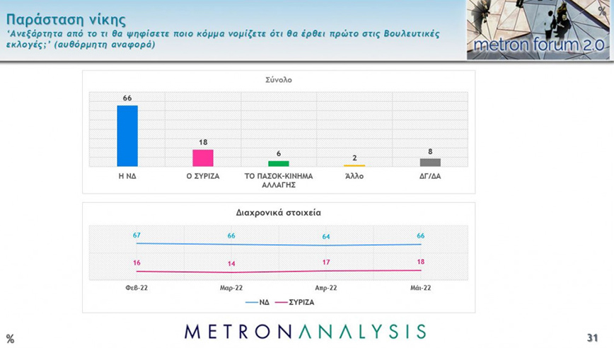 Στο ερώτημα «ανεξάρτητα από το τι θα ψηφίζατε, ποιο κόμμα νομίζετε ότι θα έρθει πρώτο στις εκλογές), το 66% πιστεύει ότι θα νικήσει η ΝΔ.