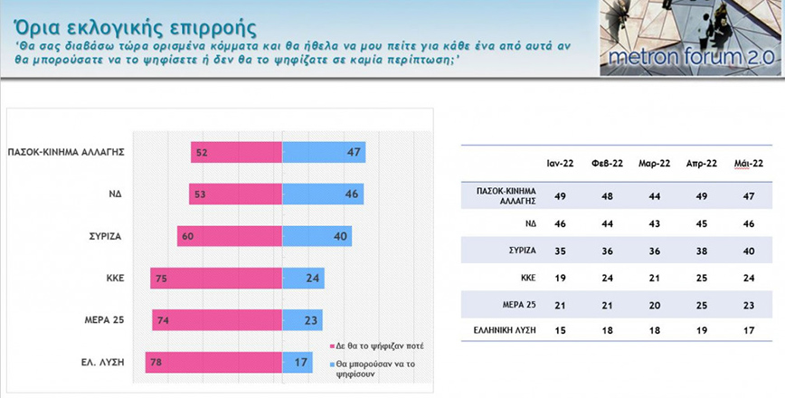 Σχετικά με την εκλογική επιρροή, οι πολίτες λένε ότι θα ψήφιζαν ΠΑΣΟΚ σε κάθε περίπτωση σε ποσοστό 52% και δεν θα ψήφιζε το 47%.