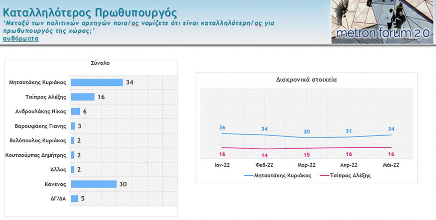 Μεταξύ των πολιτικών αρχηγών ο Κυριάκος Μητσοτάκης παίρνει ποσοστό 34% ως προς την καταλληλότητα για πρωθυπουργός. Ακολουθεί με 16% ο Αλέξης Τσίπρας, ο Νίκος Ανδρουλάκης με 6%, ο Γιάνης Βαρουφάκης με 3%, ο Κυριάκος Βελόπουλος, ο Δημήτρης Κουτσούμπας με 2%.