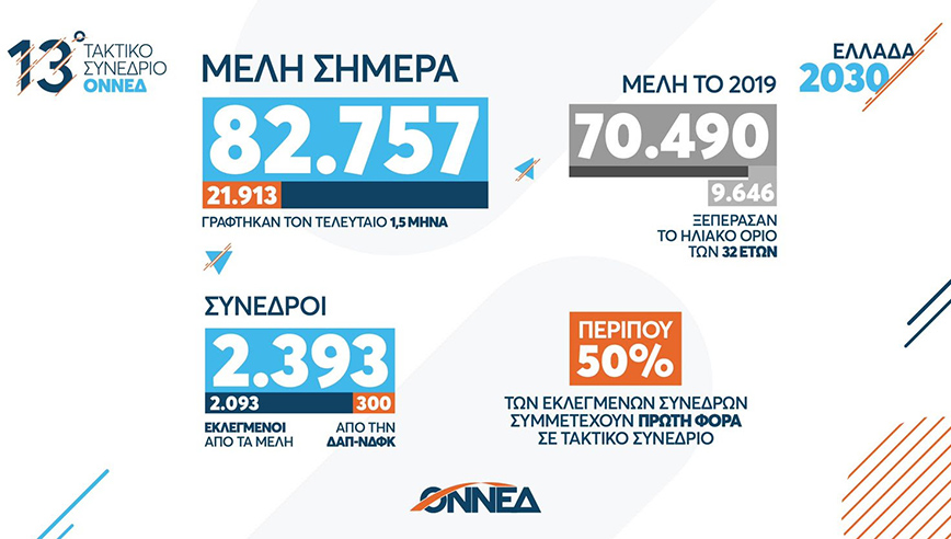 Σημειώνεται, επίσης, πως ενώ 9.646 μέλη ξεπέρασαν το ηλικιακό όριο, μέσα σε 1,5 μήνα εγγράφηκαν στο Εθνικό Μητρώο Μελών της ΟΝΝΕΔ 21.913 νέα μέλη. Επίσης, όπως μεταδίδει το Αθηναϊκό Πρακτορείο Ειδήσεων σχεδόν το 50% των εκλεγμένων συνέδρων συμμετέχουν για πρώτη φορά σε συνέδριο της ΟΝΝΕΔ.