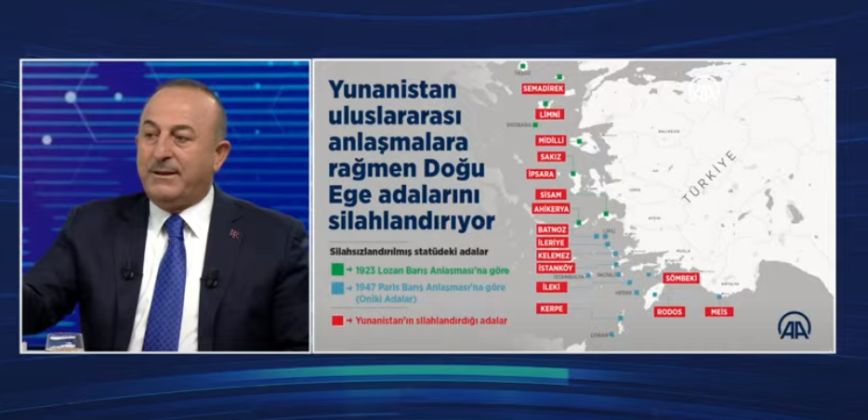 Παράλληλα, επανέλαβε τους τουρκικούς ισχυρισμούς περί αποστρατιωτικοποίησης των ελληνικών νησιών σημειώνοντας: «Υπάρχει ένας όρος και στις δυο συνθήκες για αποστρατιωτικοποίηση. Η Ελλάδα από το 1960 τα στρατιωτικοποιεί με απειλή από την Τουρκία ως δικαιολογία. Τα νησιά πρέπει να αποστρατιωτικοποιηθούν. Αν δεν υποχωρήσει η Ελλάδα θα ανοίξουμε προς συζήτηση το θέμα κυριαρχίας τους».