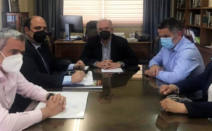 Αρχικά, επισκέφθηκε τον δήμο Ι.Π. Μεσολογγίου και το δημαρχείο, όπου πραγματοποίησε συνάντηση εργασίας με τον δήμαρχο, Κωνσταντίνο Λύρο, παρουσία και του βουλευτή Κωνσταντίνου Καραγκούνη, με αντικείμενο την πορεία αποκατάστασης των περιοχών του δήμου που υπέστησαν ζημιές από τα έντονα καιρικά φαινόμενα που σημειώθηκαν κατά τους προηγούμενους μήνες.