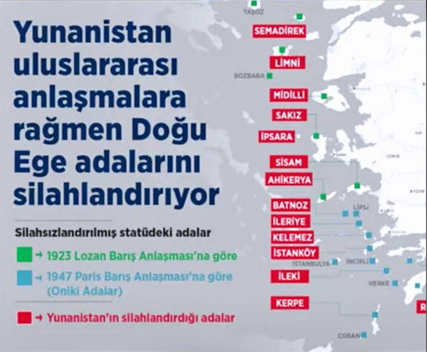 Μόλις χθες ο υπουργός Εξωτερικών Μεβλούτ Τσαβούσογλου έδειξε εκ νέου χάρτη του Αρχιπελάγους λέγοντας ότι η χώρα του αμφισβητήσει την εδαφική κυριαρχία ελληνικών νησιών από τη Σαμοθράκη μέχρι το Καστελόριζο, αν αυτά δεν αποστρατιωτικοποιηθούν. «Υπάρχει όρος και στις δυο συνθήκες, Λωζάνης και Παρισιού, για αποστρατιωτικοποίηση. Η Ελλάδα από το 1960 τα στρατιωτικοποιεί. Τα νησιά αυτά δεν πρέπει να έχουν πάνω στρατό. Αν δεν υποχωρήσει η Ελλάδα θα ανοίξουμε προς συζήτηση το θέμα κυριαρχίας τους» επεσήμανε, προσθέτοντας πως έχει στείλει δύο επιστολές στον ΟΗΕ, με τις οποίες καταγγέλλει την Αθήνα για… παραβίαση των συνθηκών. Μάλιστα κατηγόρησε τους Έλληνες πολιτικούς ότι νιώθουν πως δεν μπορούν να ευχαριστήσουν τους πολίτες τους αν δεν κάνουν επιθετικές παρατηρήσεις κατά της Τουρκίας, τουλάχιστον 5-10 φορές την ημέρα.