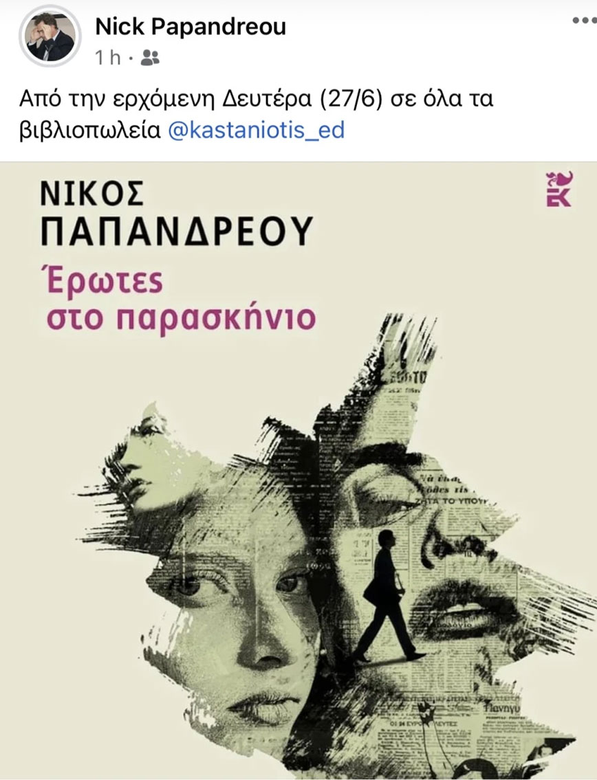 «Έρωτες στο παρασκήνιο» τιτλοφορείται το νέο βιβλίο του συγγραφέα και πολιτικού Νίκου Παπανδρέου, που αναμένεται να κυκλοφορήσει την επόμενη Δευτέρα από τις εκδόσεις Καστανιώτη. Σε αυτό, ο αδελφός του πρώην πρωθυπουργού και πρώτος επιλαχών ευρωβουλευτής του ΠΑΣΟΚ – ΚΙΝΑΛ, πλησιάζει μία ιστορία έρωτα και πολιτικής, ξεκαθαρίζοντας ωστόσο ότι η αφήγηση δεν στηρίζεται σε αληθινά πρόσωπα, παρά το γεγονός ότι μοιάζουν να είναι πραγματικά, όπως και τα συμβάντα που περιγράφει.