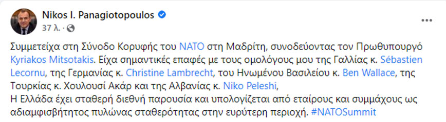 «Συμμετείχα», ανέφερε επίσης, «στη Σύνοδο Κορυφής του NATO στη Μαδρίτη, συνοδεύοντας τον πρωθυπουργό Κυριάκο Μητσοτάκη. Είχα σημαντικές επαφές με τους ομολόγους μου της Γαλλίας Σεμπστιέν Λεκορνού, της Γερμανίας Κριστίνε Λάμπρεχτ, του Ηνωμένου Βασιλείου Μπεν Ουάλας, της Τουρκίας Χουλουσί Ακάρ και της Αλβανίας Νίκο Πέλεσι».