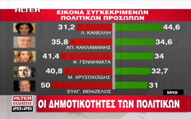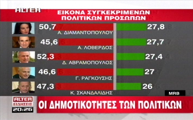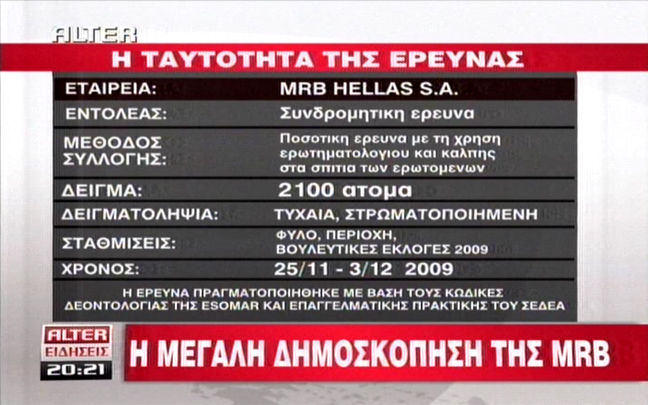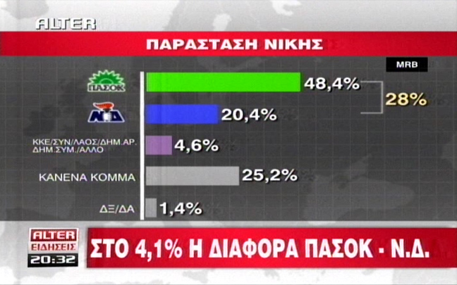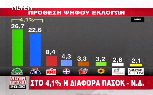 Ειδικότερα, στην ερώτηση για την πρόθεση ψήφου, οι ερωτηθέντες έφεραν πρώτο ΠΑΣΟΚ με 26,7%, τη ΝΔ να έπεται με 22,7%, το ΚΚΕ με 8,4% (το μεγαλύτερο δημοσκοπικό αποτέλεσμα του κόμματος), τον ΛΑΟΣ με 4,3%, τον ΣΥΝ με 3,3%, τους Οικολόγους Πρασίνους με 3,3%, τη Δημοκρατική Συμμαχία με 2,8% και τη Δημοκρατική Αριστερά με 2,1%.