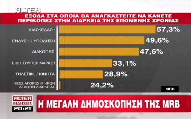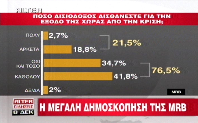 Για την εξέλιξη της οικονομικής κατάστασης στην Ελλάδα τους επόμενους 12 μήνες, στην πλειοψηφία τους (78%) οι ερωτηθέντες ψηφοφόροι εκτιμούν ότι θα χειροτερέψει. Σε ποσοστό μόλις 3,2% εκτιμούν ότι θα βελτιωθεί και 17% ότι θα μείνει στάσιμη. Σχετικά με το ενδεχόμενο της χρεοκοπίας, ποσοστό 46,6% των ερωτηθέντων θεωρούν ότι είναι πιθανό, σε αντίθεση με ποσοστό 41,5%, που δεν το βλέπουν.