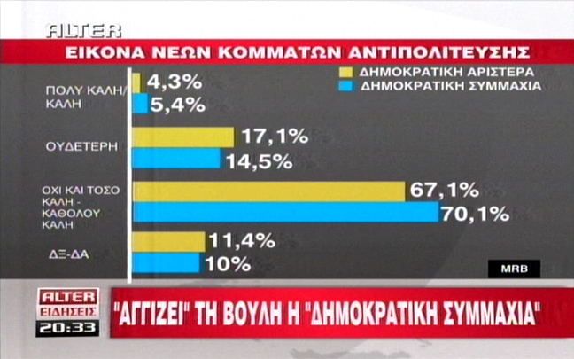 Επτακομματική βουλή και ποσοστό, αθροιστικά, για τα δύο μεγάλα κόμματα κάτω του 50%, «βλέπει» η εξαμηνιαία δημοσκόπηση της εταιρίας MRB, η πρώτη μετά τις αυτοδιοικητικές εκλογές.