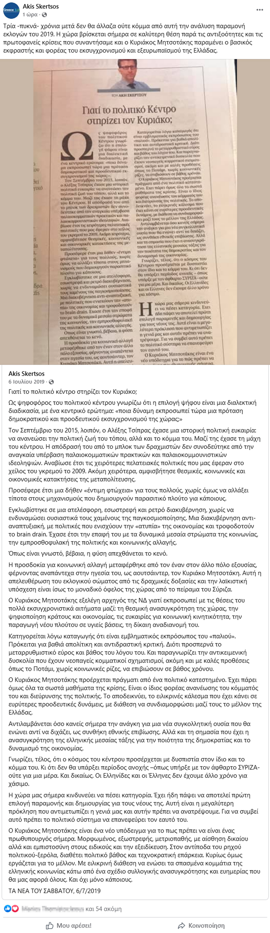 O Άκης Σκέρτσος εστιάζει σε παλαιότερο άρθρο του στην εφημερίδα «Τα Νέα», τρία χρόνια πριν, παραμονή εκλογών τότε όπως επισημαίνει τώρα, δεν θα άλλαζε ούτε κόμμα ακόμη και σήμερα.