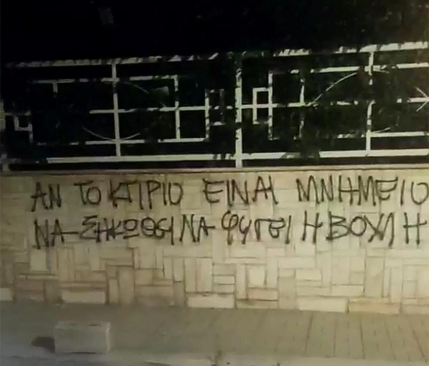 Παρέμβαση στο σπίτι του γενικού γραμματέα της Βουλής Γιώργου Μυλωνάκη πραγματοποίησε το βράδυ της Πέμπτης (7/7) ο Ρουβίκωνας. Τα μέλη της συλλογικότητας έγραψαν συνθήματα στη μάντρα και πέταξαν τρικάκια.
