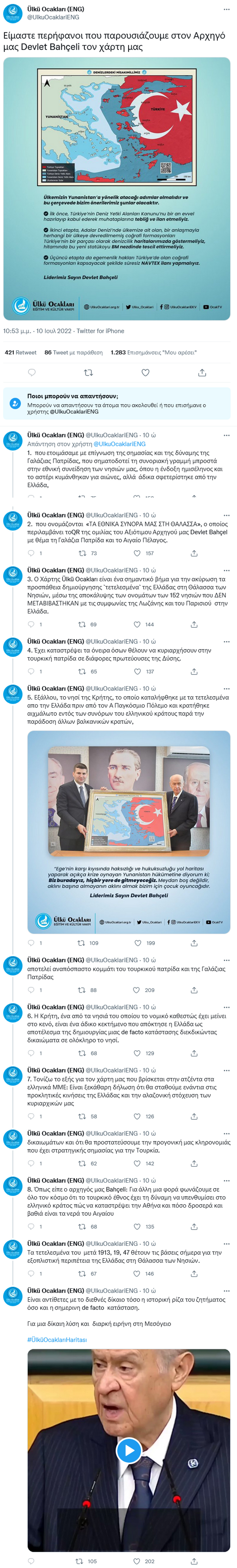 Τονίζω το εξής για τον χάρτη μας που βρίσκεται στην ατζέντα στα ελληνικά ΜΜΕ: Είναι ξεκάθαρη δήλωση ότι θα σταθούμε ενάντια στις προκλητικές κινήσεις της Ελλάδας και την αλαζονική στόχευση των κυριαρχικών μας δικαιωμάτων και ότι θα προστατεύσουμε την προγονική μας κληρονομιάς που έχει στρατηγικής σημασίας για την Τουρκία. Όπως είπε ο αρχηγός μας Bahçeli: Για άλλη μια φορά φωνάζουμε σε όλο τον κόσμο ότι το τουρκικό έθνος έχει τη δύναμη να υπενθυμίσει στο ελληνικό κράτος πώς να καταστρέψει την Αθήνα και πόσο δροσερά και βαθιά είναι τα νερά του Αιγαίου Τα τετελεσμένα του μετά 1913, 19, 47 θέτουν τις βάσεις σήμερα για την εξοπλιστική περιπέτεια της Ελλάδας στη Θάλασσα των Νησιών. Είναι αντίθετες με το διεθνές δίκαιο τόσο η ιστορική ρίζα του ζητήματος όσο και η σημερινη de facto κατάσταση».