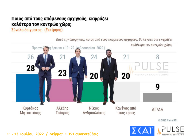 Για το ποιος από τους Μητσοτάκη, Τσίπρα, Ανδρουλάκη εκφράζει καλύτερα τον χώρο του κέντρου. Το 28% λέει τον Κυριάκο Μητσοτάκη, το 23% τον Αλέξη Τσίπρα, το 20% τον Νίκο Ανδρουλάκη, ενώ 20% λέει κανένας από τους τρεις. Στο 9% οι ΔΓ/ΔΑ.