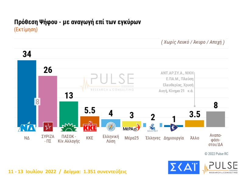 Στη δημοσκόπηση της εταιρείας Pulse για τον ΣΚΑΪ η διαφορά της Νέας Δημοκρατίας από τον ΣΥΡΙΖΑ βρίσκεται στις μονάδες 8 μονάδες.