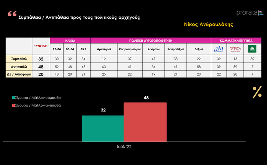 Τρίτος στη σχετική λίστα, ο Νίκος Ανδρουλάκης, συγκεντρώνοντας στον δείκτη συμπάθειας ποσοστό 32%, έχοντας όμως το μικρότερο ποσοστό αντιπάθειας (48%).