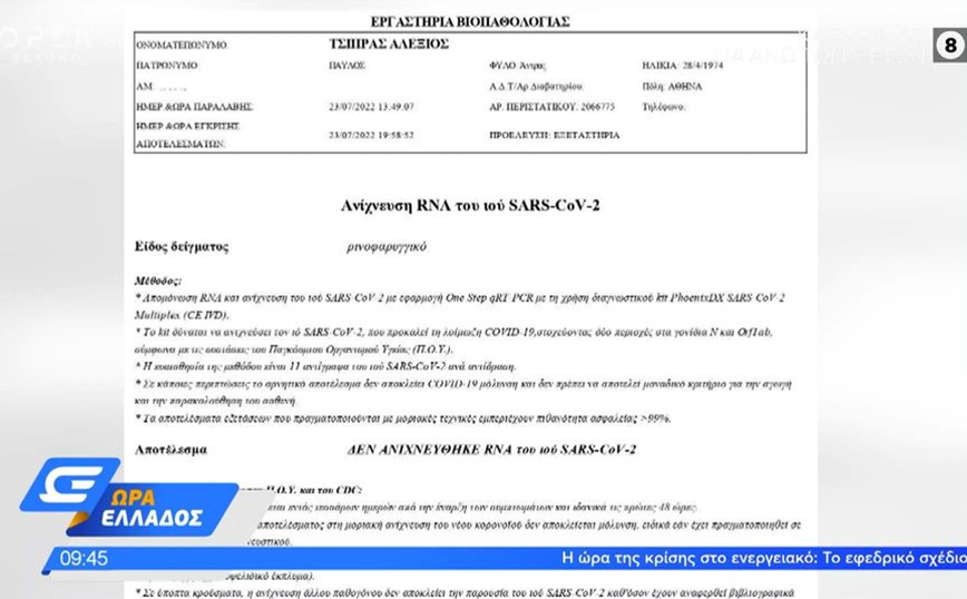 Από την πλευρά του ΣΥΡΙΖΑ η απάντηση ήρθε με τη δημοσιοποίηση του αρνητικού PCR του Αλέξη Τσίπρα από το περασμένο Σάββατο στον ίδιο τηλεοπτικό σταθμό.