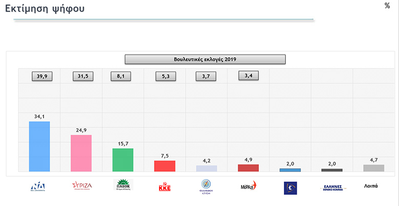 Σε ότι αφορά την εκτίμηση της ψήφου αυτή διαμορφώνεται ως εξής: 34,1% Νέα Δημοκρατία, το 24,9% ΣΥΡΙΖΑ, το 15,7% ΠΑΣΟΚ, το 7,5% ΚΚΕ, το 4,2% Ελληνική Λύση, το 4,9% Μέρα25, το 2% Εθνική Δημιουργία, 2% Έλληνες Εθνικό Κόμμα.
