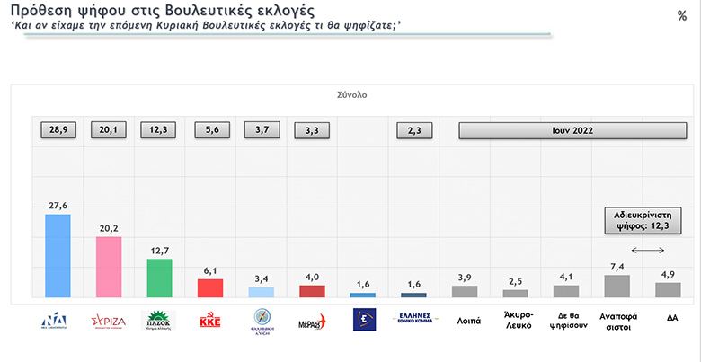 «Αν είχαμε την επόμενη Κυριακή Βουλευτικές εκλογές τι θα ψηφίζατε;» ρωτήθηκαν οι συμμετέχοντες και το 27,6% απάντησε Νέα Δημοκρατία, το 20,2% ΣΥΡΙΖΑ, το 12,7% ΠΑΣΟΚ, το 6,1% ΚΚΕ, το 3,4% Ελληνική Λύση, το 4% Μέρα25, το 1,6% Εθνική Δημιουργία, το 1,6 Έλληνες Εθνικό Κόμμα.