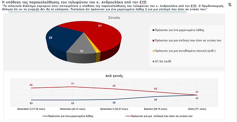 «Το τελευταίο διάστημα κυριαρχεί στην επικαιρότητα η υπόθεση της παρακολούθησης του τηλεφώνου του κ. Ανδρουλάκη από την ΕΥΠ. Ο Πρωθυπουργός δήλωσε ότι αν το γνώριζε δεν θα το επέτρεπε. Πιστεύετε ότι πρόκειται για ένα μεμονωμένο λάθος ή για μια επιλογή που ήταν σε γνώση του;» ήταν η επόμενη ερώτηση που τέθηκε στους συμμετέχοντες. Το 61% των ερωτηθέντων απάντησε πως πρόκειται για μια επιλογή που ήταν σε γνώση του ενώ το 28% θεωρεί πως είναι ένα μεμονωμένο λάθος.